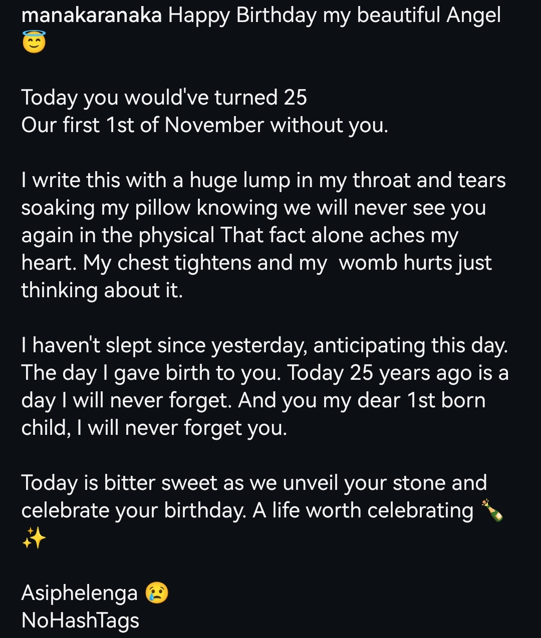 “I haven’t slept since yesterday, anticipating this day. The day I gave birth to you. Today, 25 years ago, is a day I will never forget. And you my dear 1st born child, I will never forget you,” she added.