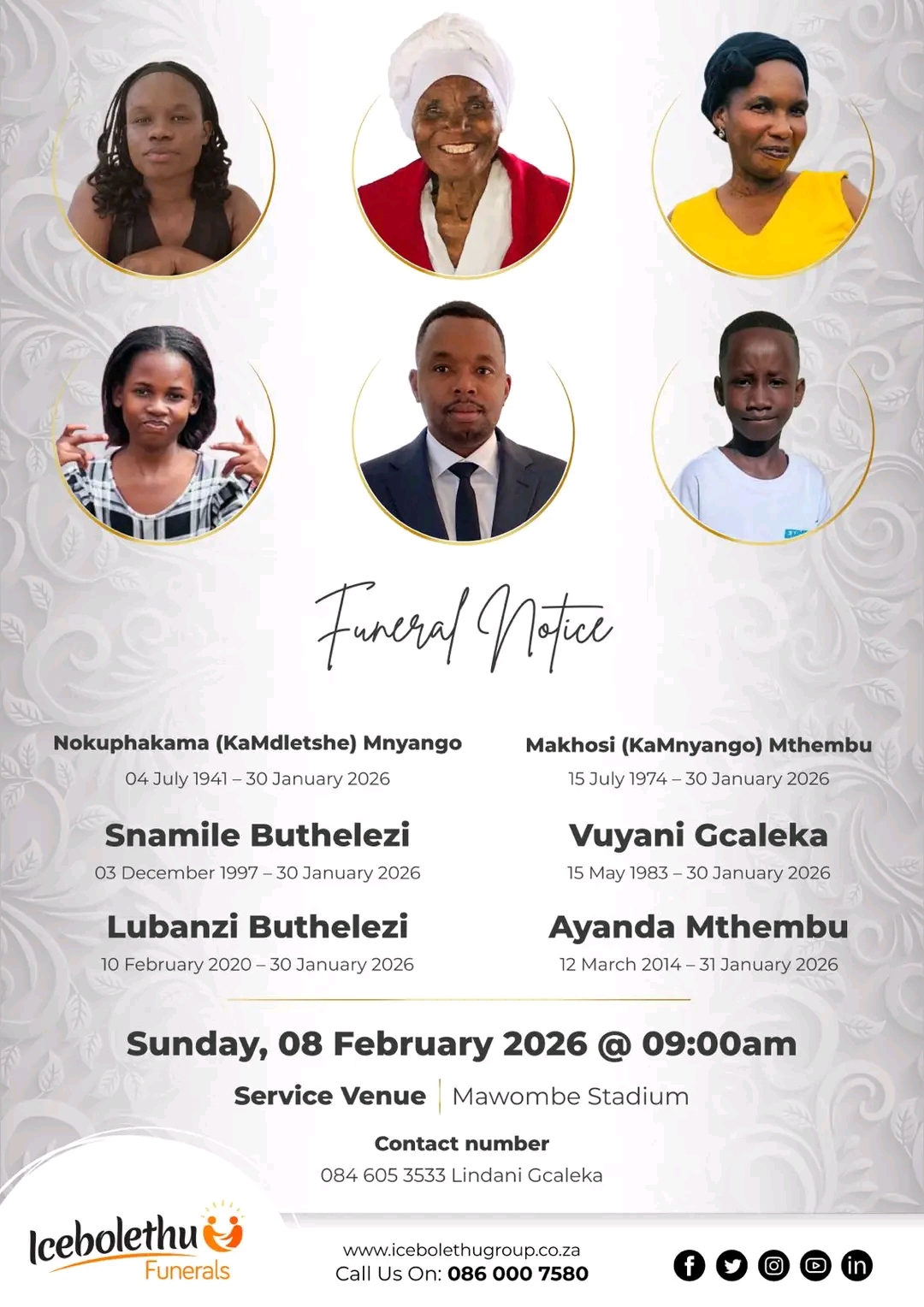 The funeral service was held on Sunday, 8 February 2026, at eMawombe Sports Field under the uMfolozi Local Municipality, where government leaders, community members and bereaved relatives gathered to pay their final respects.