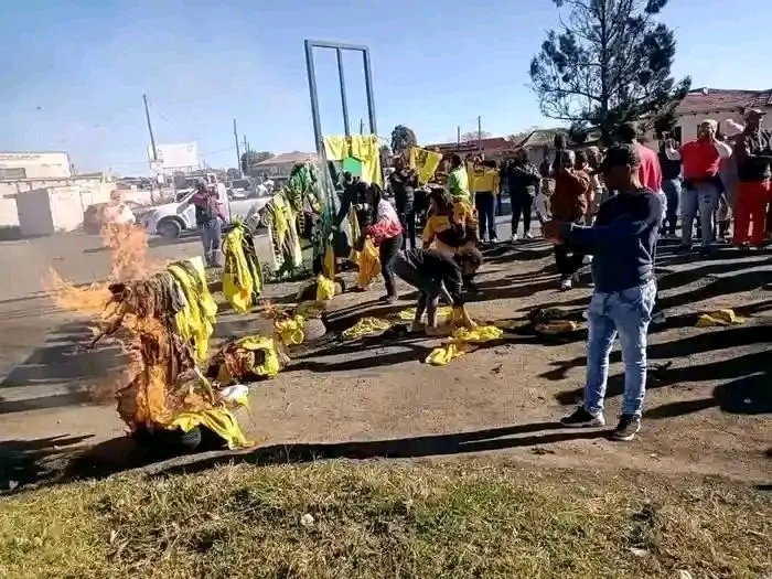In the video, multiple yellow and green garments, which are synonymous with the ANC’s branding, are seen being set alight in a heap on the road.